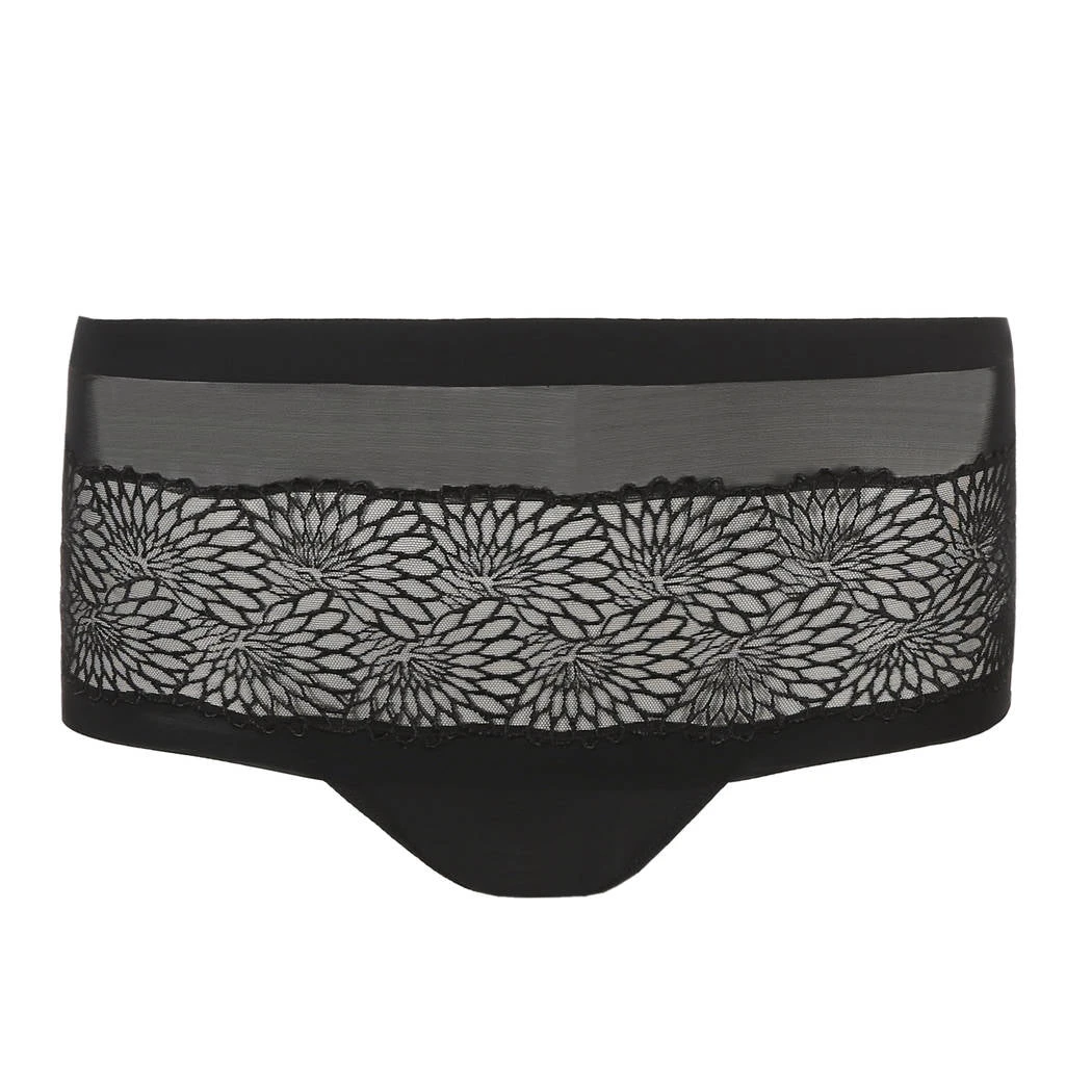 Un shorty à l’irrésistible look rétro, orné de dentelle noire posée sur un tulle couleur chair. Broderie noire avec effet tatouage irrésistible !
