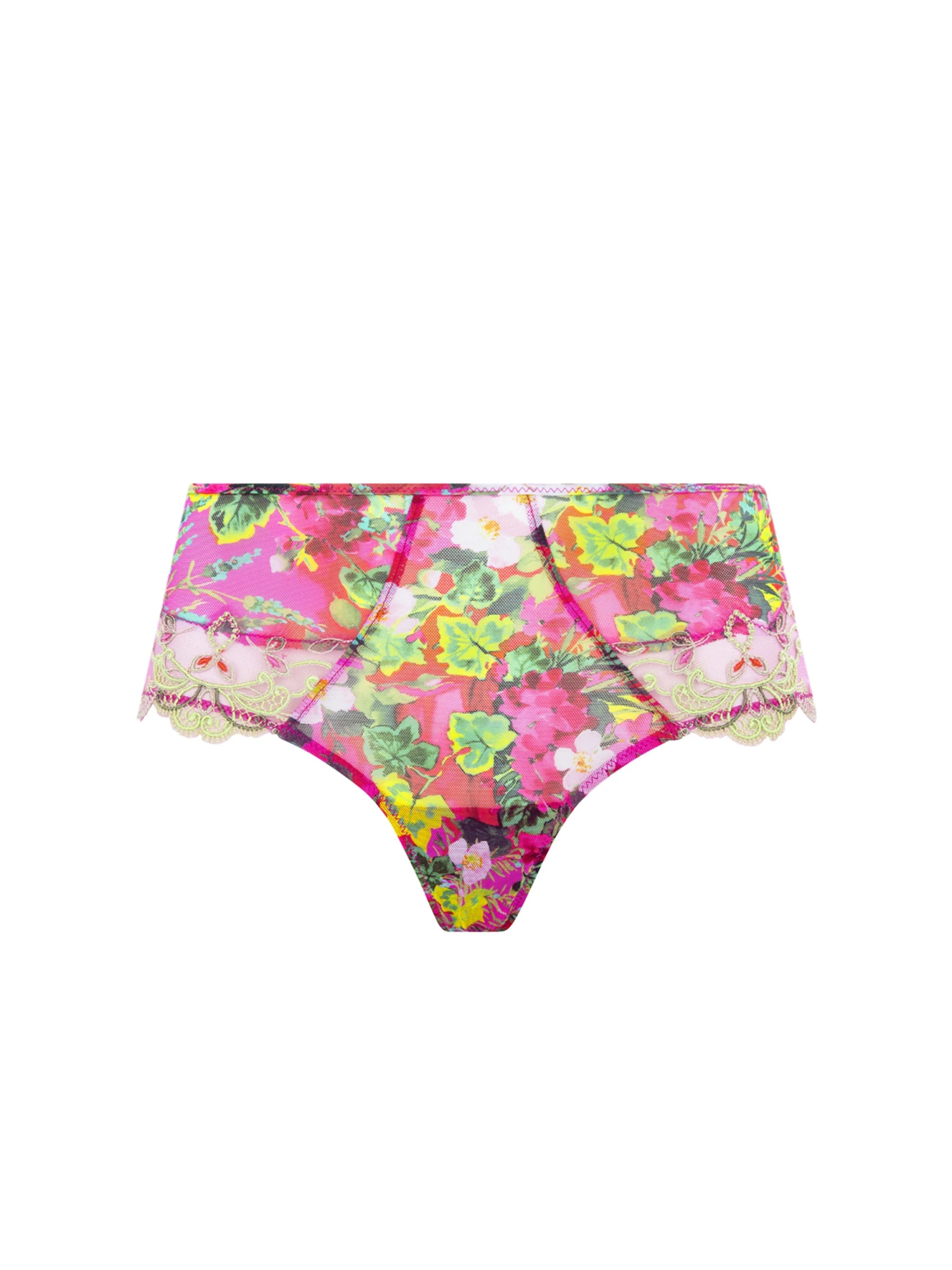 Modèle en tulle imprimé avec une découpe élancée au devant, agrémenté de galon festoné brodé multifils aux cuisses devant, ainsi qu’un médaillon trianglulaire à la taille milieu dos. La taille est soulignée d’un fin bordage élastique en tulle imprimé.